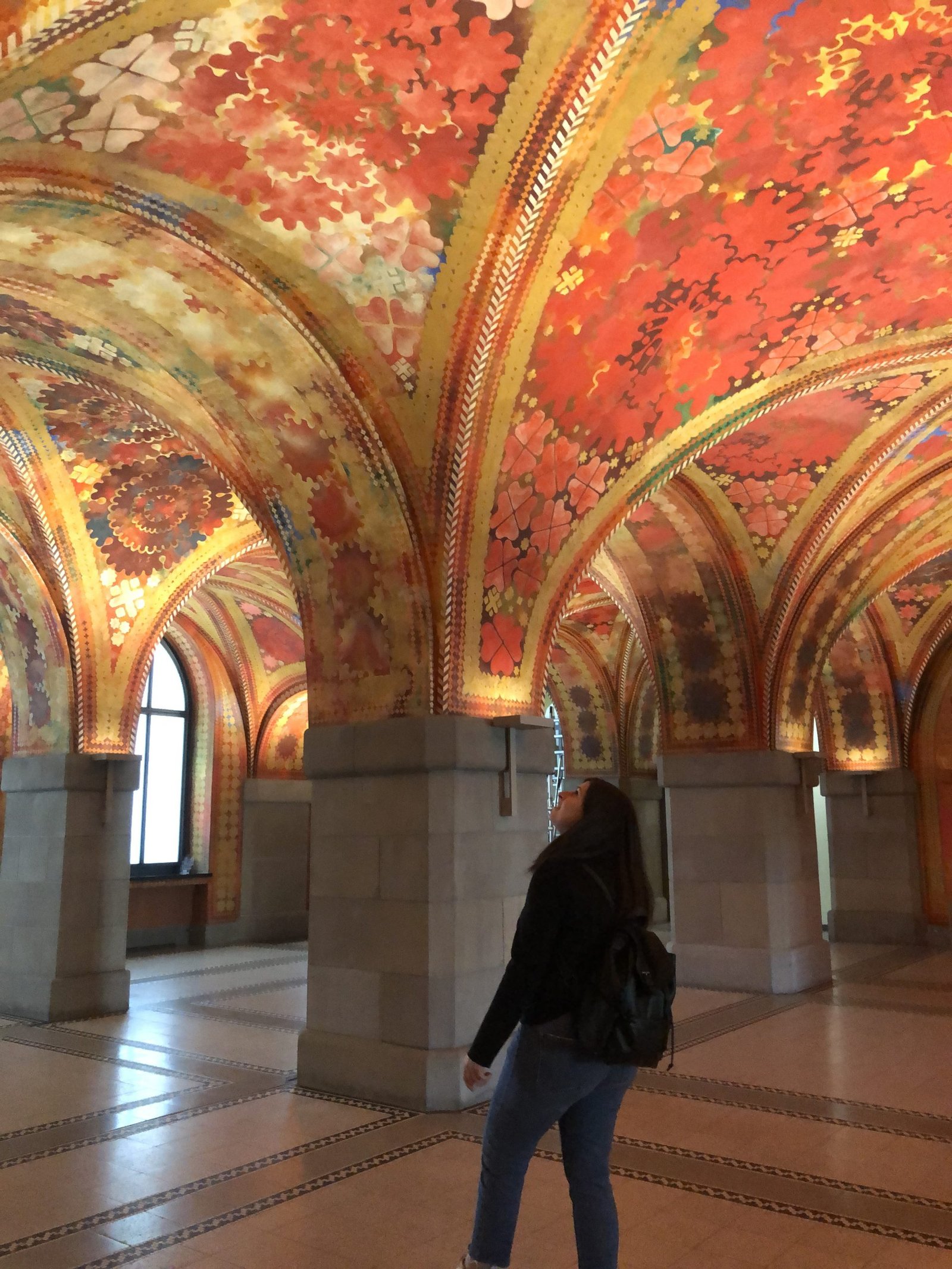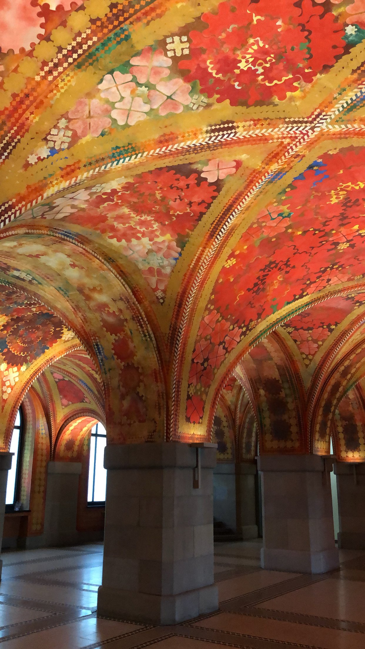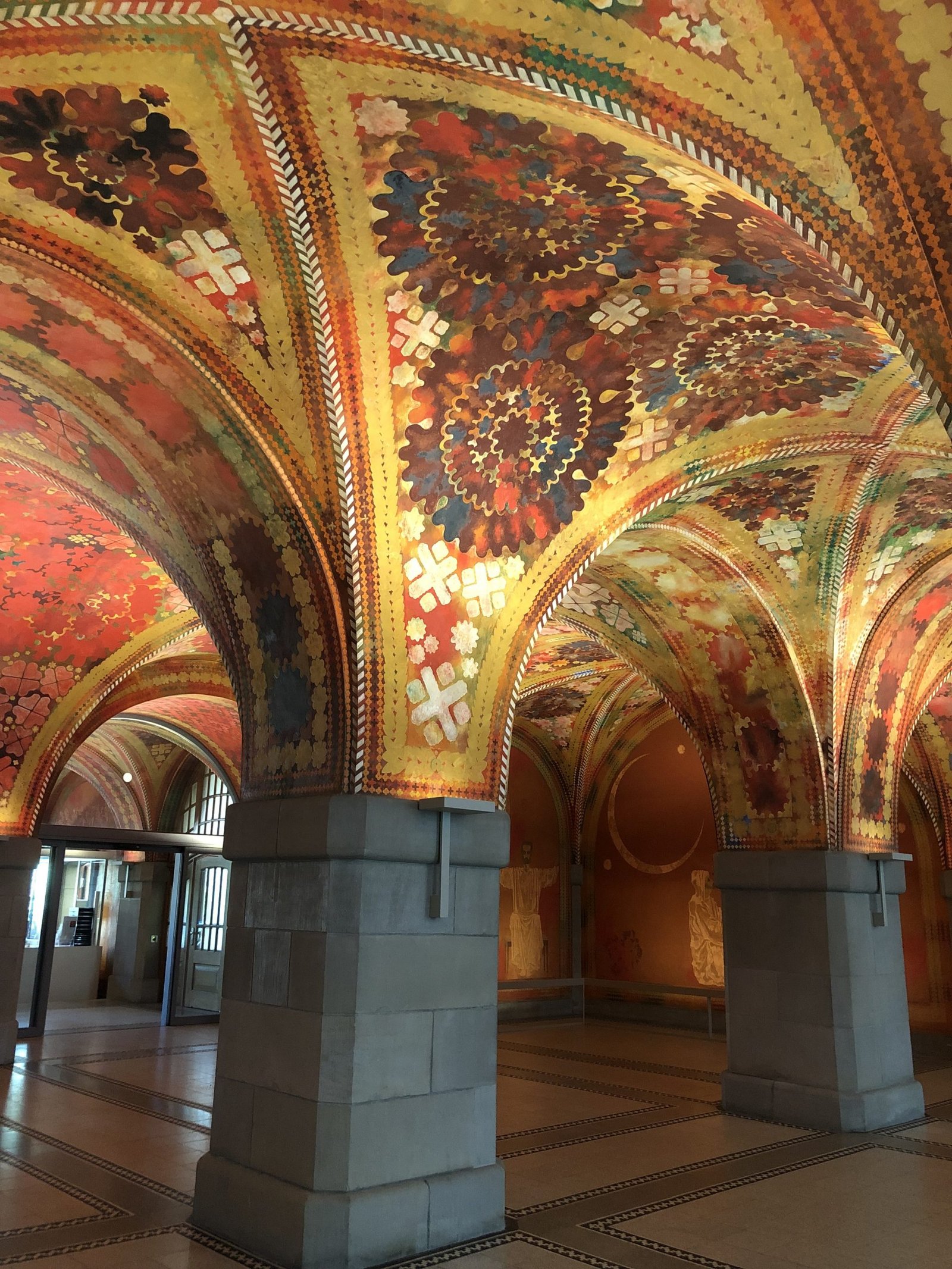 Entrando nel grande edificio, che si trova vicino la stazione centrale, accederai a questo salone dipinto con tonalità che vanno dal rosso al giallo ocra. Per i disegni del soffitto della Sala Giacometti si sono scelti tantissimi motivi floreali e geometrici, mentre sulle pareti sono rappresentati lavoratori e scienziati all’opera.