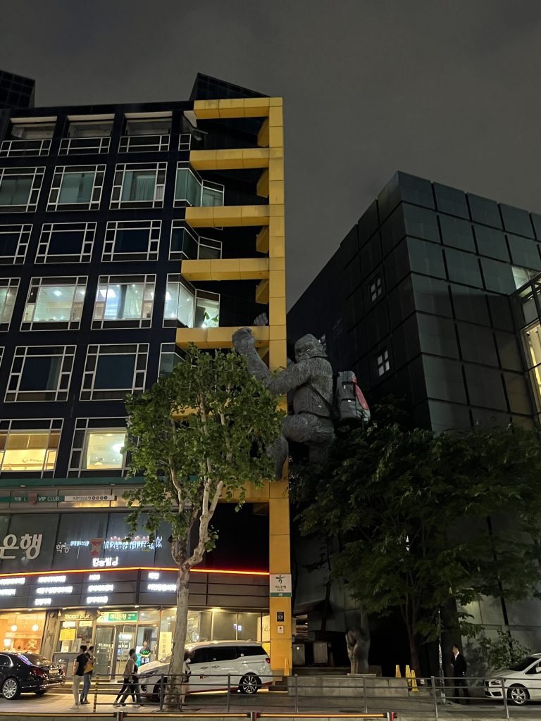Camminando nel quartiere di Gangnam, uno dei più nuovi di Seoul a sud del fiume Han, si può trovare una scultura di un gorilla armato di zaino sulle spalle che si arrampica su un condominio.