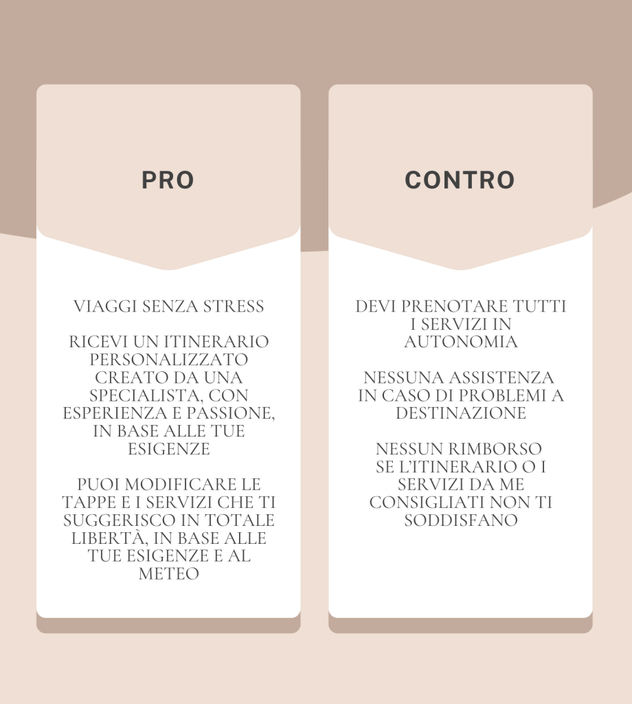 - una volta che tutto sarà definitivo, ti invierò tutto il materiale necessario: itinerario completo, consigli utili, link cliccabili da cui prenotare in autonomia i vari servizi che ti ho consigliato e anche qualche dritta extra su come vivere al meglio la tua destinazione. A quel punto, non ti resterà che goderti il viaggio!