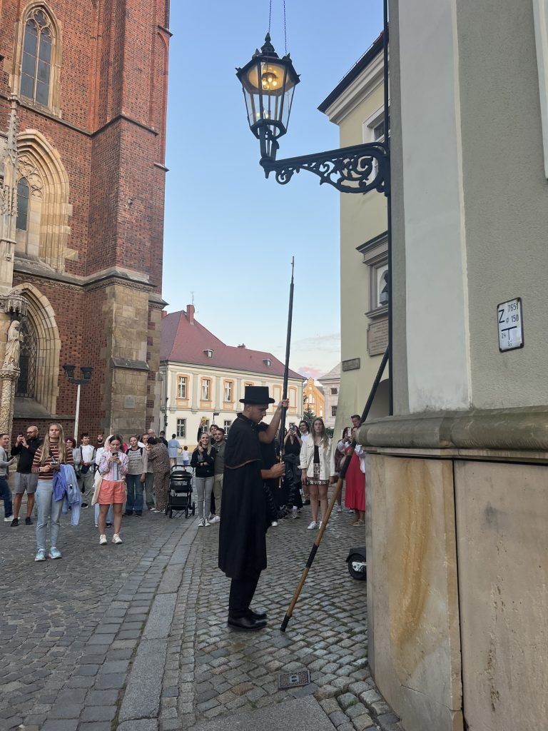 Questa figura storica indossa un mantello nero, un cappello a cilindro e un abbigliamento che richiama epoche passate è una delle attrazioni più romantiche e suggestive di Wrocław, anche se abbiamo trovato il tutto un po’ imbarazzante per lui, dato che ad ogni passo che faceva veniva seguito da centinaia di persone e per ogni lampione riceveva un applauso. Però è molto suggestivo da vedere.