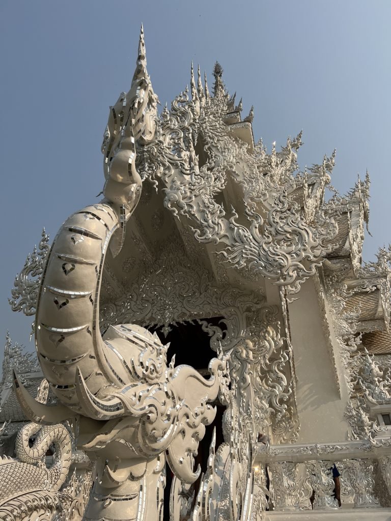 - il White Temple, uno dei templi più belli di tutta la Thailandia; con il suo colore bianco simboleggia la purezza del Buddha e i suoi tantissimi specchietti nell’intonaco, che luccicano con la luce del sole, sono simbolo di saggezza. Ogni dettaglio di questo tempio ha un suo preciso significato. Intorno ad esso è inoltre presente un giardino con sculture bizzarre.
