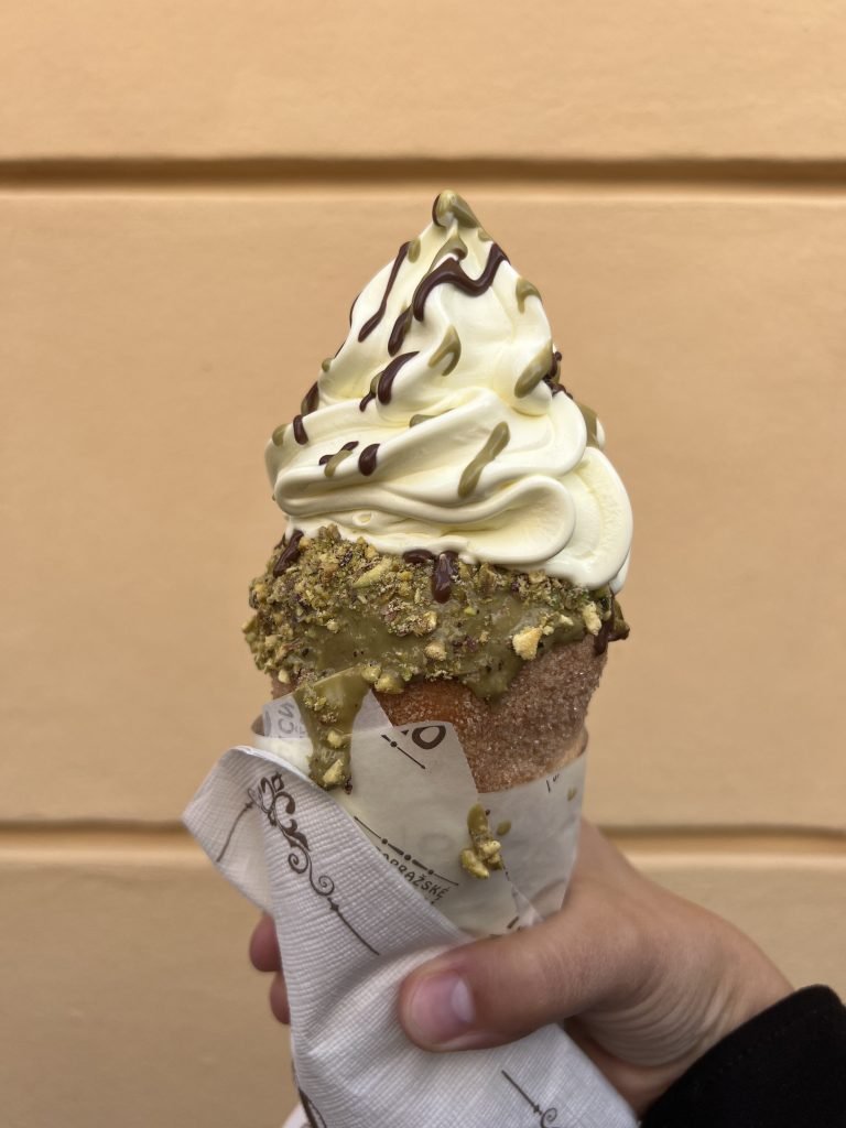 Viene spesso guarnito con gelato artigianale all’interno, cioccolata, panna montata, frutta, Nutella o Dubai Chocolate.