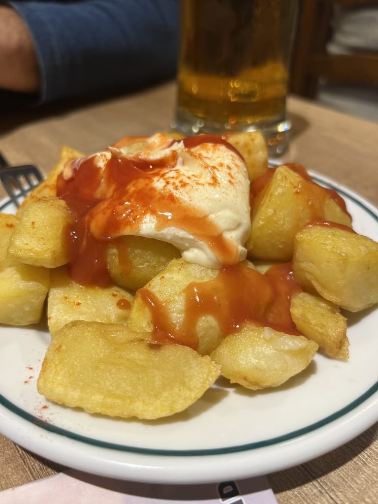 Le patatas bravas sono delle patate fritte tagliate a cubetti o a spicchi, croccanti all’esterno e morbide all’interno, condite con una salsa piccante (la “salsa brava”) a base di pomodoro, aglio, olio d’oliva, paprika e peperoncino e una salsa aioli, a base di aglio e olio d’oliva.