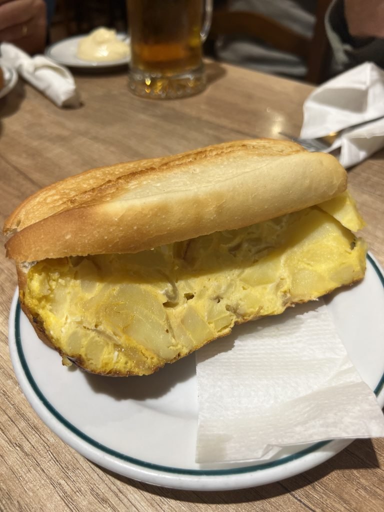 - bocadillo de Tortilla Española, con all’interno la tortilla de patatas, un altro simbolo della cucina spagnola, che non è una semplice frittata con una e cipolla, ma qualcosa di molto più gustoso.