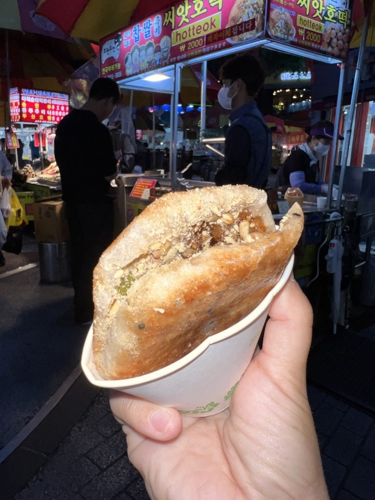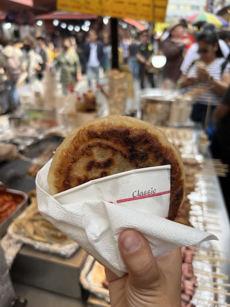 Altro snack gustoso e molto fritto è il fried pancake, che può essere semplice o con all’interno mozzarella filante. Noi lo abbiamo preso a Seoul al mercato sulla Myeong Dong.