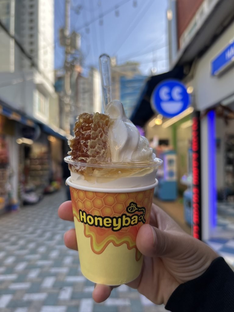 Come già detto, i coreani vanno pazzi per il miele e lo mettono ovunque, anche sul gelato! Vi capiterà sicuramente di vedere sia a Seoul che a Busan nei negozietti che preparano questo gelato bianco con sopra tantissimo miele e tanta gente che lo mangia per la strada. Noi non abbiamo resistito e l’abbiamo voluto provare.