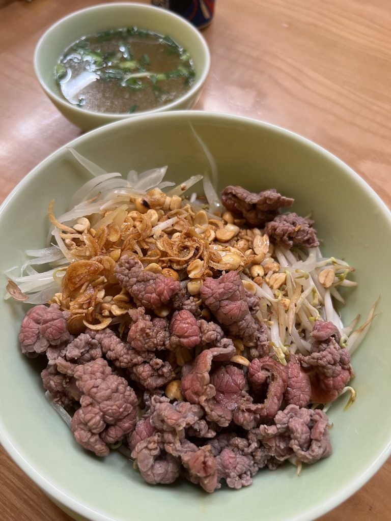 Il cao lau è un piatto a base di noodle tipico della zona di Hoi An. Viene servito con poco brodo e carne di maiale, pelle di maiale croccante e verdure e spezie piccanti che si possono aggiungere a piacere.