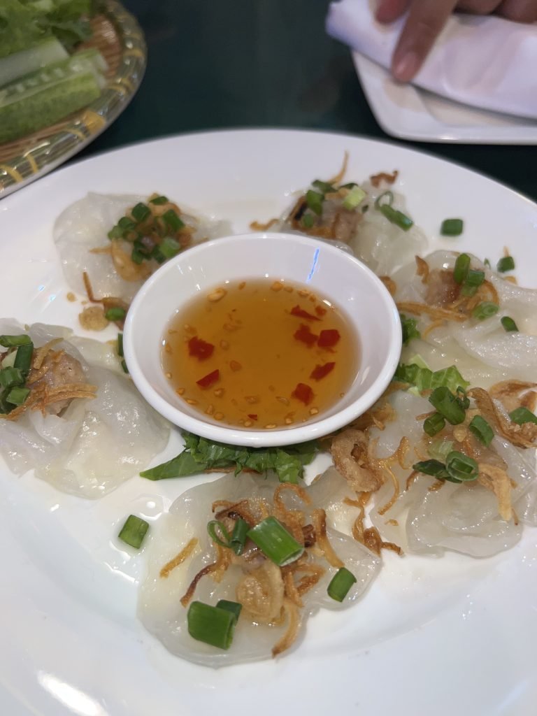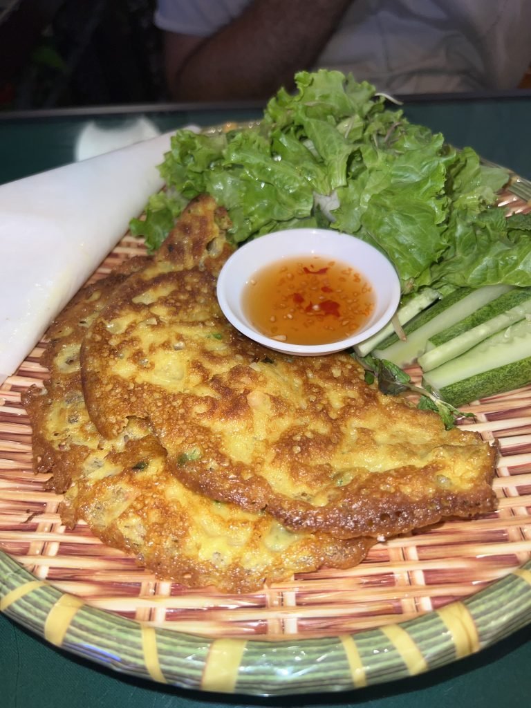 Altra cosa da mangiare assolutamente in Vietnam è il bánh xèo, una sorta di omelette vietnamita, a base di curcuma, che gli da il caratteristico colore giallo. L’impasto è fatto di solito con farina di riso e latte di cocco e il ripieno è di carne, gamberi, maiale e fagioli. È servito accompagnato da cetrioli, carote, lattuga, menta e basilico.