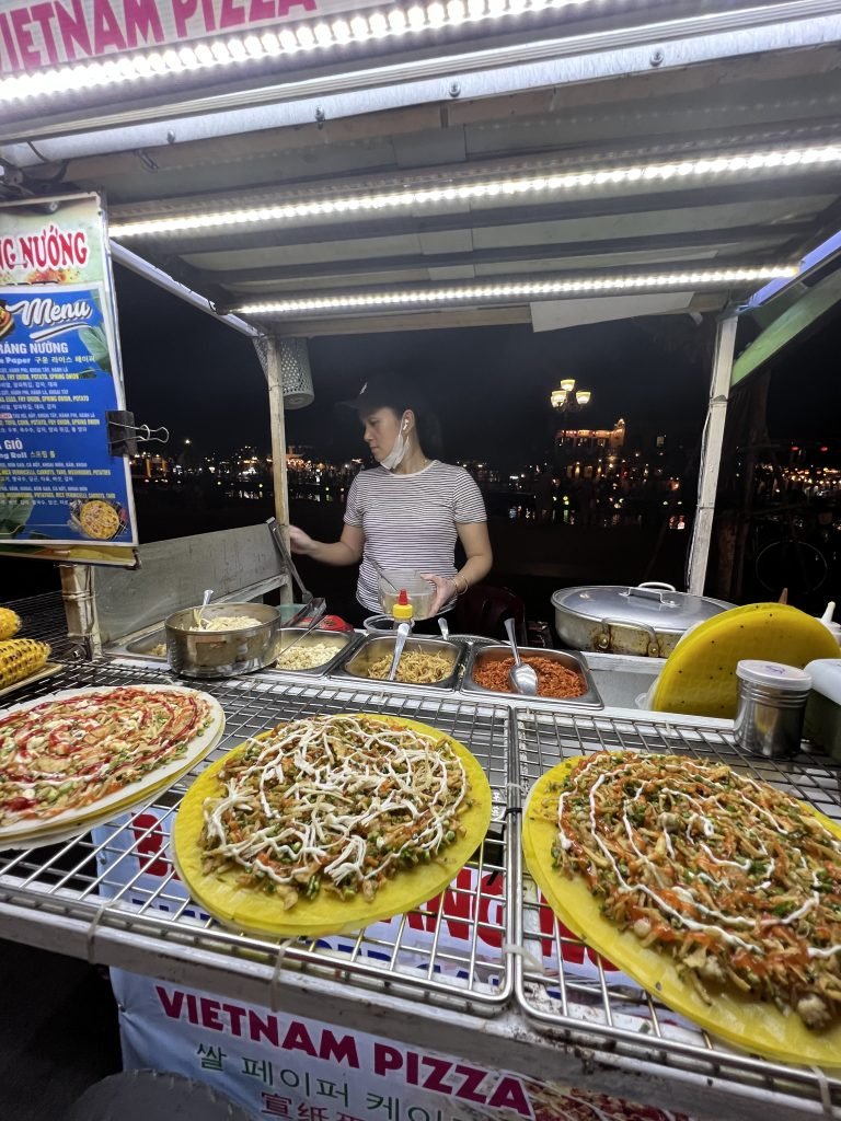 Potete trovarla nei ristoranti, o come snack di street food: la pizza vietnamita, conosciuta come Bánh Tráng Nướng, è carta di riso grigliata utilizzata come base per la pizza. I condimenti possono essere di tutti i tipi e principalmente uovo, cipollotto, formaggio e carne in scatola, con l’aggiunta di maionese e altre spezie.