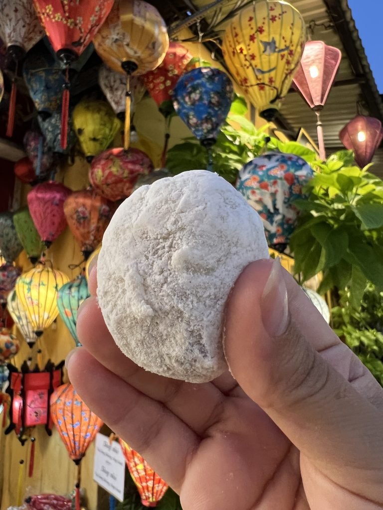 La mango cake è un dolce vietnamita è venduto principalmente per le strade di Hoi An. È un impasto di riso molto molle e appiccicoso (simile al monchi), con all’interno nocciole, cocco e zucchero! Molto buono.