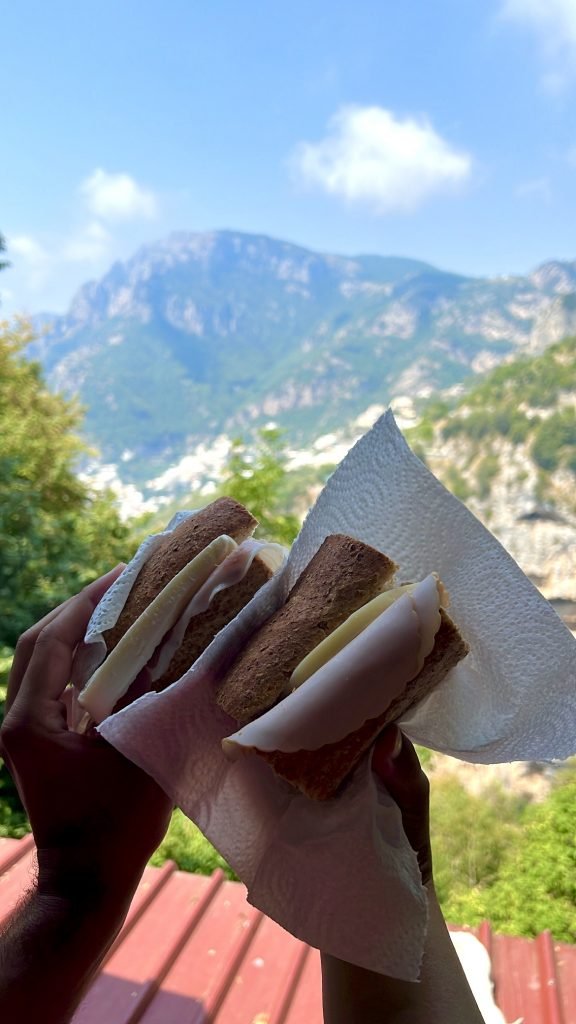 Dalla piazzetta, se risali la scalinata e giri a sinistra passerai per vari ristorantini e ti ritroverai sul percorso che conduce a Positano. Proprio sulla strada, sulla sinistra, quasi alla fine di Nocelle, si trova un piccolo negozio di alimentari, che ci ha preparato dei panini buonissimi, mangiati sulla loro terrazza con vista! Un modo economico per pranzare, non perdere troppo tempo e godersi il panorama!