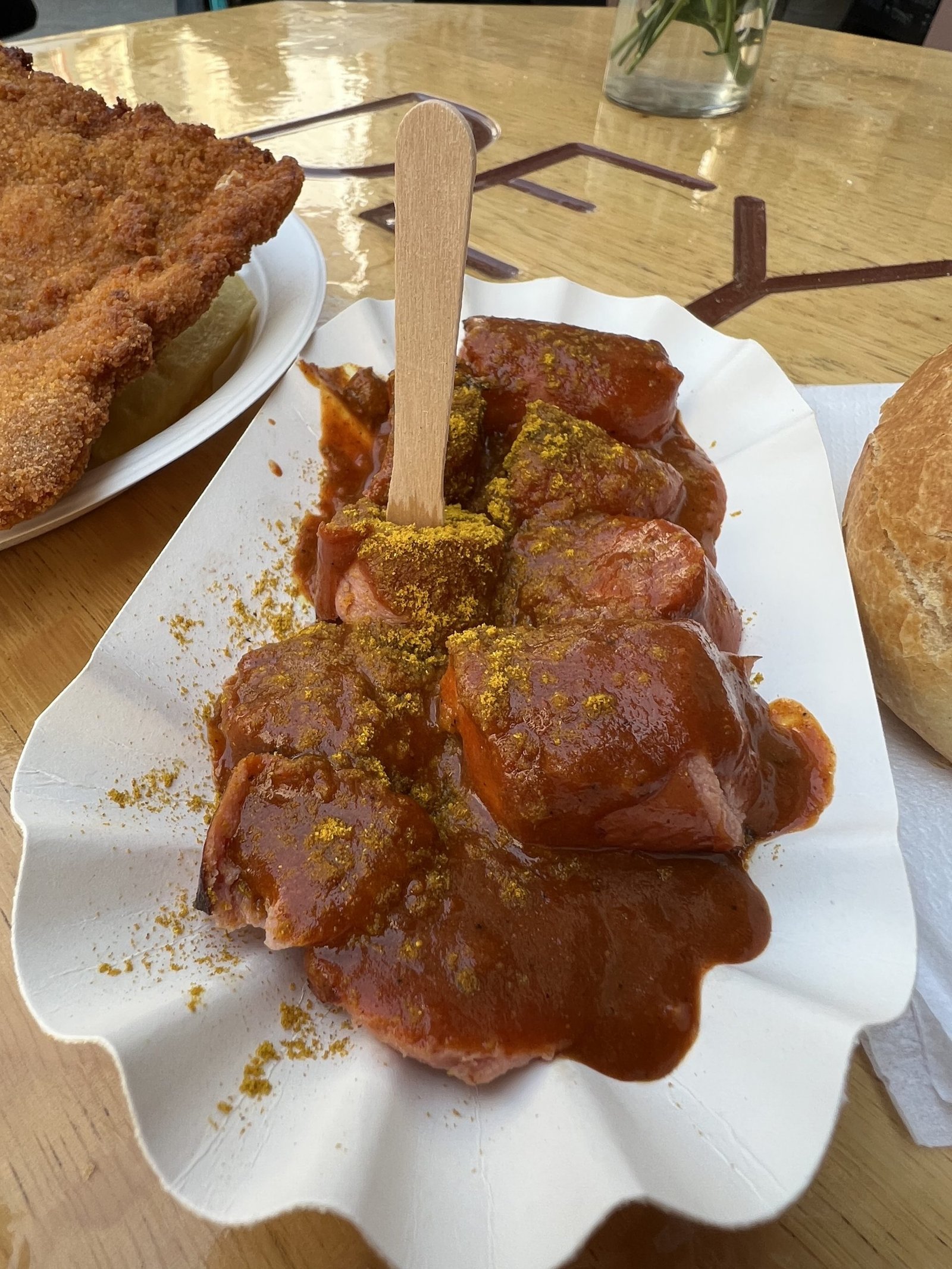 I piatti tipici della Germania e di Francoforte che ti consiglio di provare sono: il curry wurst, la schnitzel (la cotoletta), le frikadelle, ovvero delle grandi polpette e l’insalata di patate, come contorno.
