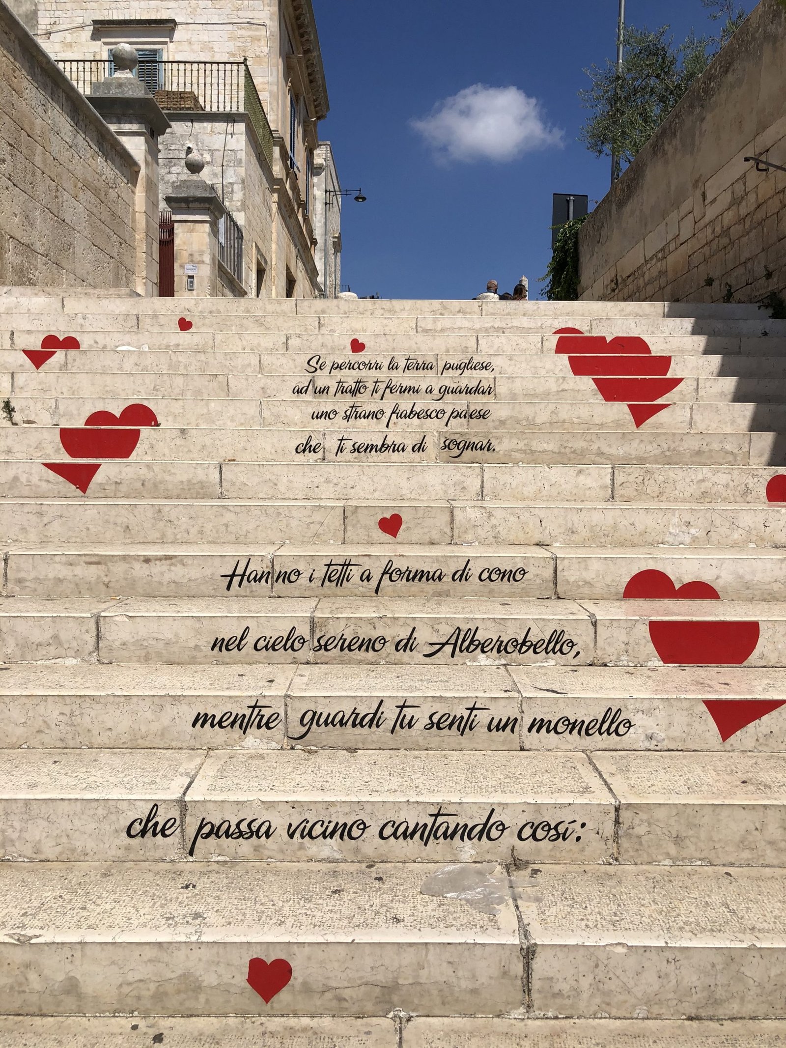 Sali la bianca scalinata che porta fino al Belvedere Terrazza Santa Lucia da cui si gode di una bellissima vista su tutti i trulli.